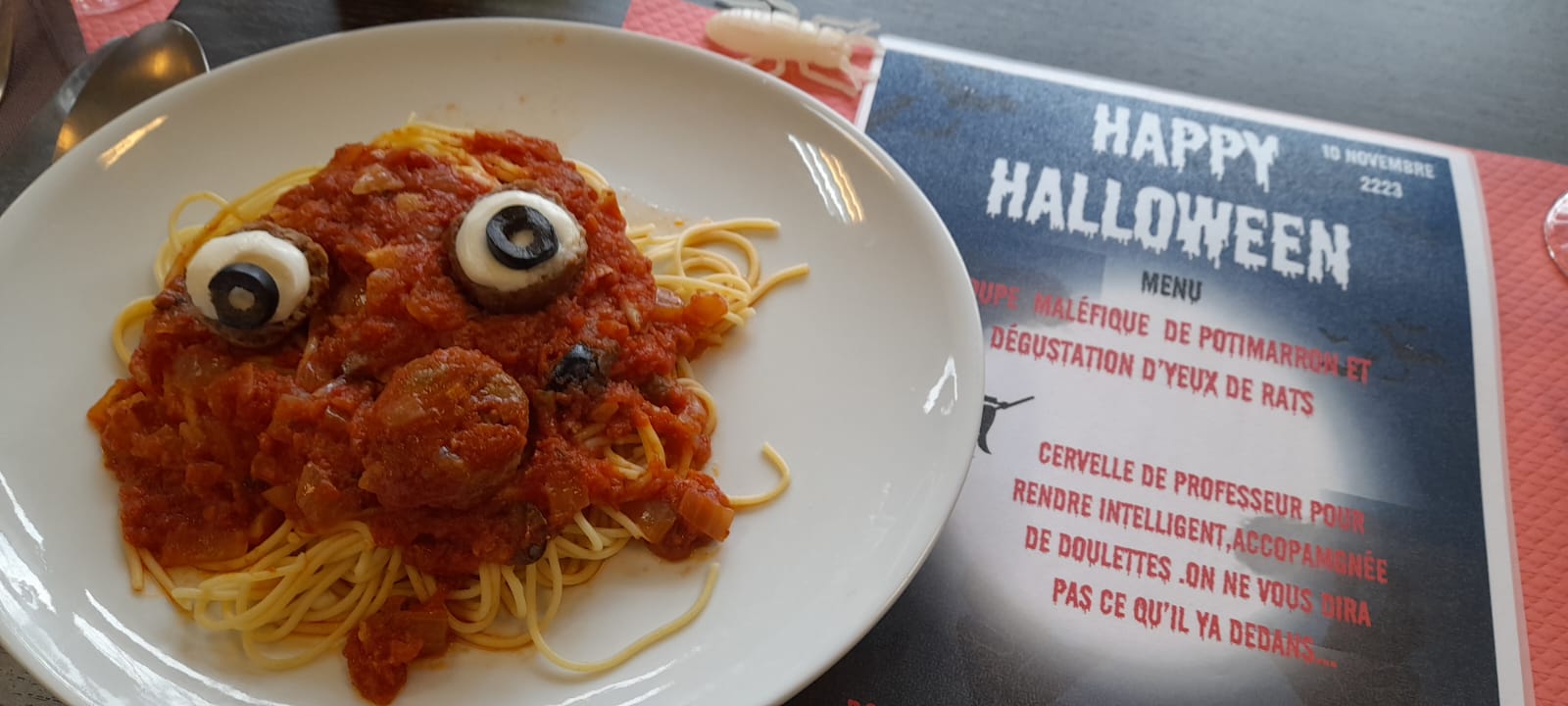 Au terrifiant menu : effroyable soupe de potimarron, spaghettis aux yeux maléfiques et doigts de sorcière.